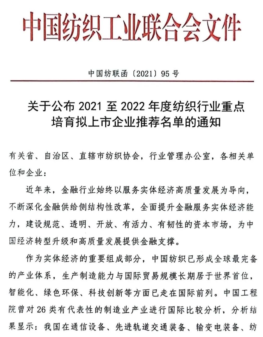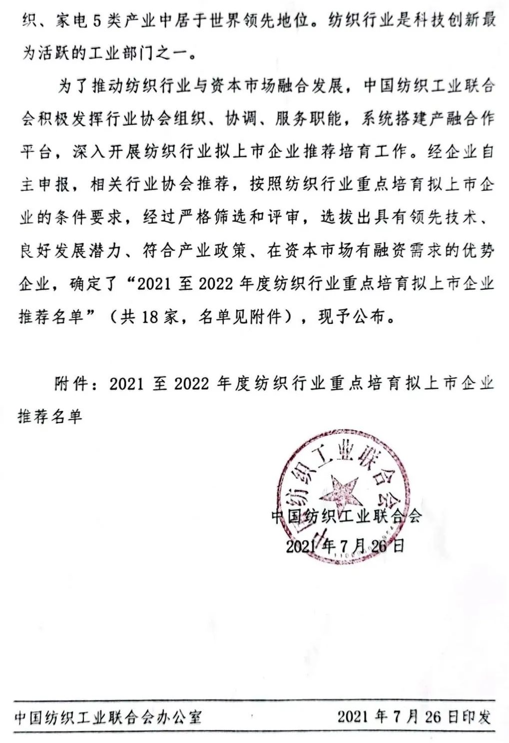 Trong năm đầu tiên của kế hoạch 5 năm lần thứ 14, Liên đoàn Công nghiệp Dệt may Trung Quốc đang đẩy nhanh quá trình hội nhập ngành dệt may và thị trường vốn. Ngày 26/7, Liên đoàn Công nghiệp Dệt may Trung Quốc đã ban hành thông báo công bố danh sách đề xuất các doanh nghiệp chủ chốt niêm yết trong ngành dệt may từ năm 2021 đến năm 2022. Sau quá trình sàng lọc, đánh giá chặt chẽ, 18 doanh nghiệp có lợi thế, công nghệ dẫn đầu, tiềm năng phát triển tốt, phù hợp với các chính sách công nghiệp và nhu cầu tài chính trên thị trường vốn đã được lựa chọn để tạo thành danh sách khuyến nghị. Các doanh nghiệp này liên quan đến vật liệu sợi mới, sản xuất thông minh, xây dựng thời trang, sản xuất xanh, dệt may công nghiệp cao cấp và các lĩnh vực khác, đây cũng là những lĩnh vực trọng điểm được hỗ trợ bởi "kế hoạch 5 năm lần thứ 14" của ngành dệt may.